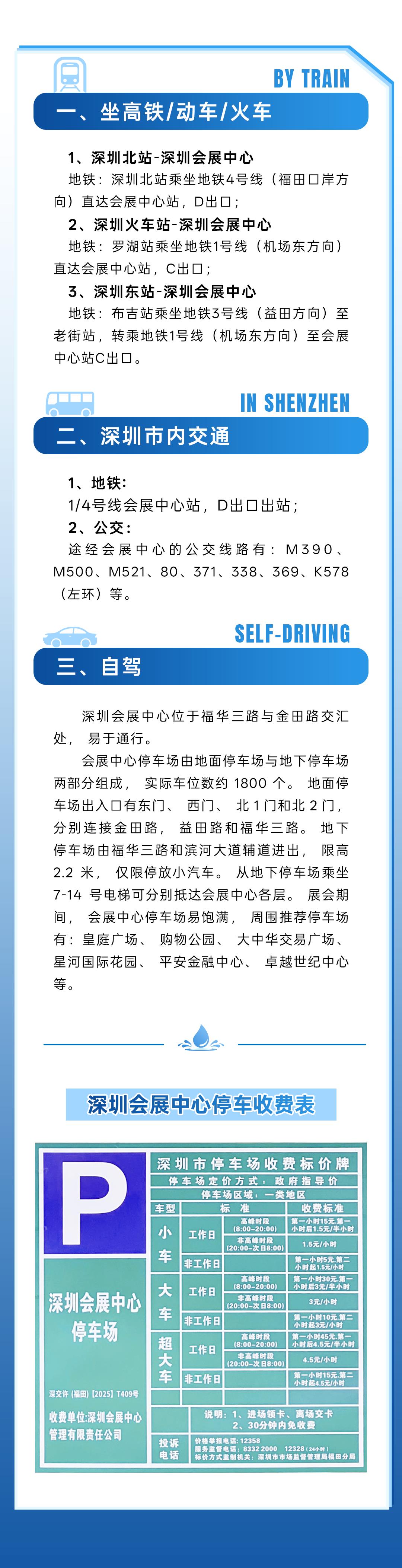 展會期間,會展中心停車場易飽滿,周圍推薦停車場有:皇庭廣場、購物公園、大中華交易廣場、星河國際花園、平安金融中心、卓越世紀中心等。