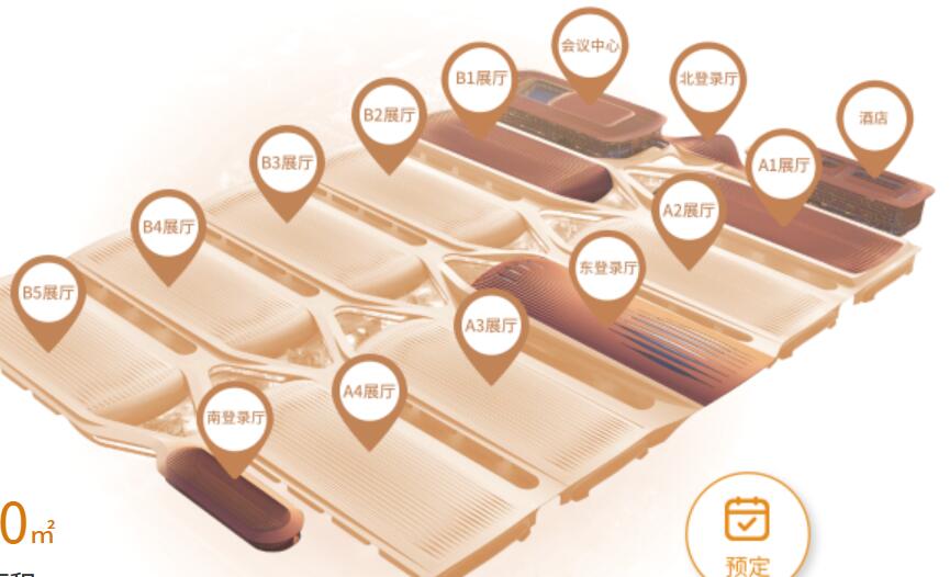 展覽中心由3個登錄廳(東、北、南)、2個無柱展廳(A1、B1)和7個有柱展廳(A2-A4、B2-B5)組成,室內凈展面積達21萬平方米,室外展場面積達5萬平方米,為參展人員提供流暢的通行路線、為展臺搭建留出充裕的布展空間、為物流運輸打造高效的行進通道。單個展廳面積 23000
